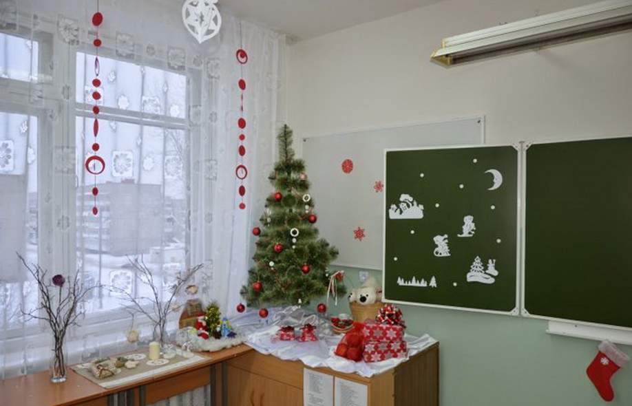 Стол учителя и парты могут также быть украшены к празднику. Однако не следует занимать большую часть рабочей поверхности, особенно мелкими деталями. Ограничьтесь окантовкой — дождиком или снежинкой, приклеенной в верхней части стола.