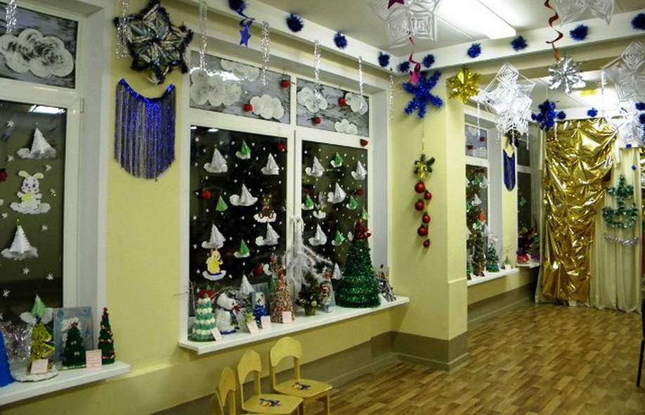 Самые большие поверхности, которые не заняты в учебном процессе — это окна, стены и потолок. Их можно украсить в новогодней тематике легкими конструкциями и композициями. Главное условие — они не должны быть слишком громоздкими и тяжелыми, чтобы обеспечить безопасность детей в классе.