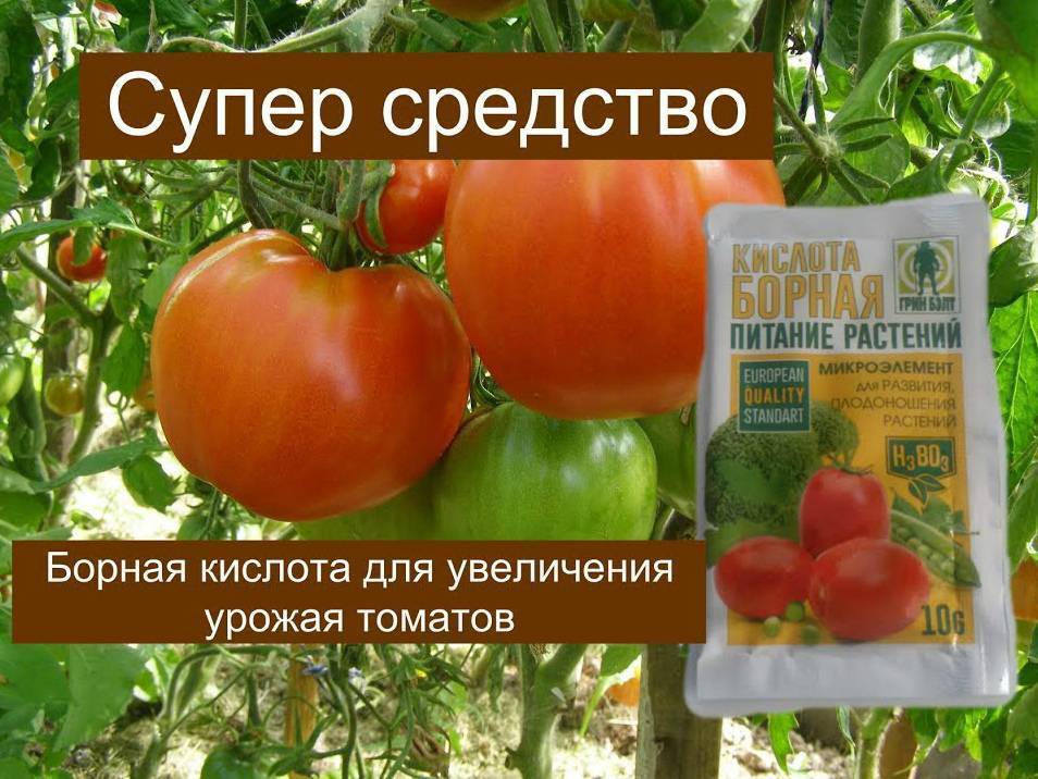 Бор — важный элемент в развитии растения. Если почва, в которой посажены томаты, испытывает его недостаток, то плоды будут более подвержены различным заболеваниям. Бор хорошо повышает цветение, что не дает помидорам гнить в случаях высокой влажности. Используя этот препарат для опрыскиваний, можно увеличить урожай на 20%.