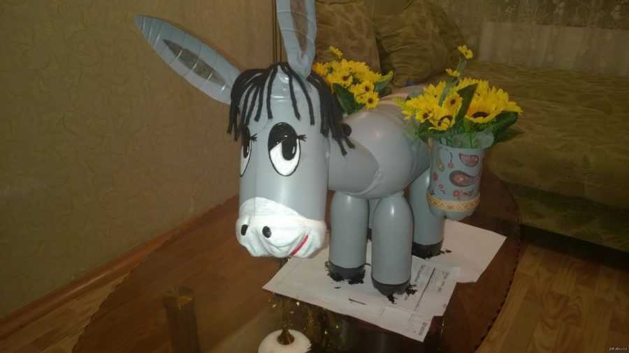 Чтобы сделать голову, у 2-литровой бутылки срезается горло, выстригаются уши, прорезается отверстие для крепления с шеей.