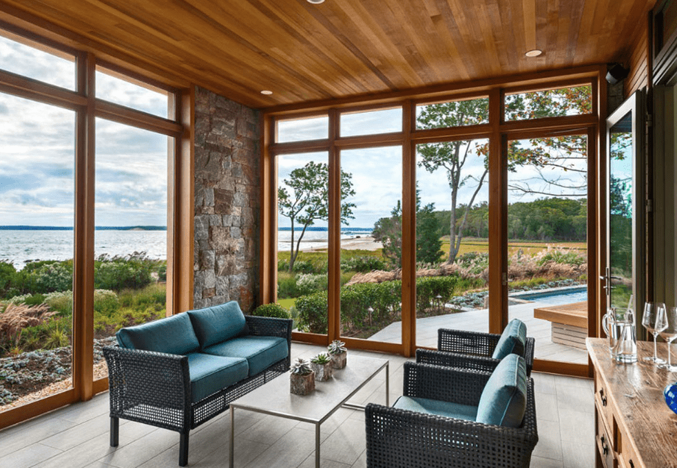 Конструкция во всю стену позволяет наполнить комнату максимальным количеством света и стереть границы пространства. Несмотря на устоявшееся мнение, такое остекление довольно функционально. Оно хорошо сохраняет тепло, изолирует шум, не пропускает сквозняки. Панорамный вариант отлично подходит для спален, гостиных или веранд.