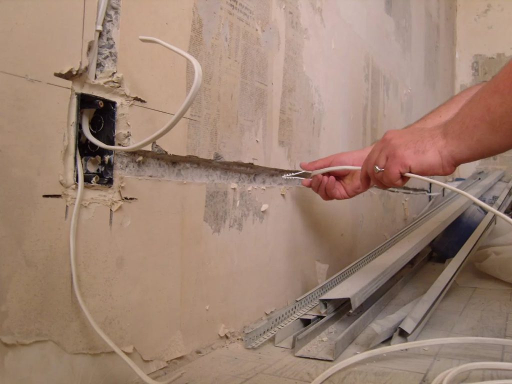 1. Сначала кабель помещается в специальную трубу-изолятор, далее прокладывается в штробе.