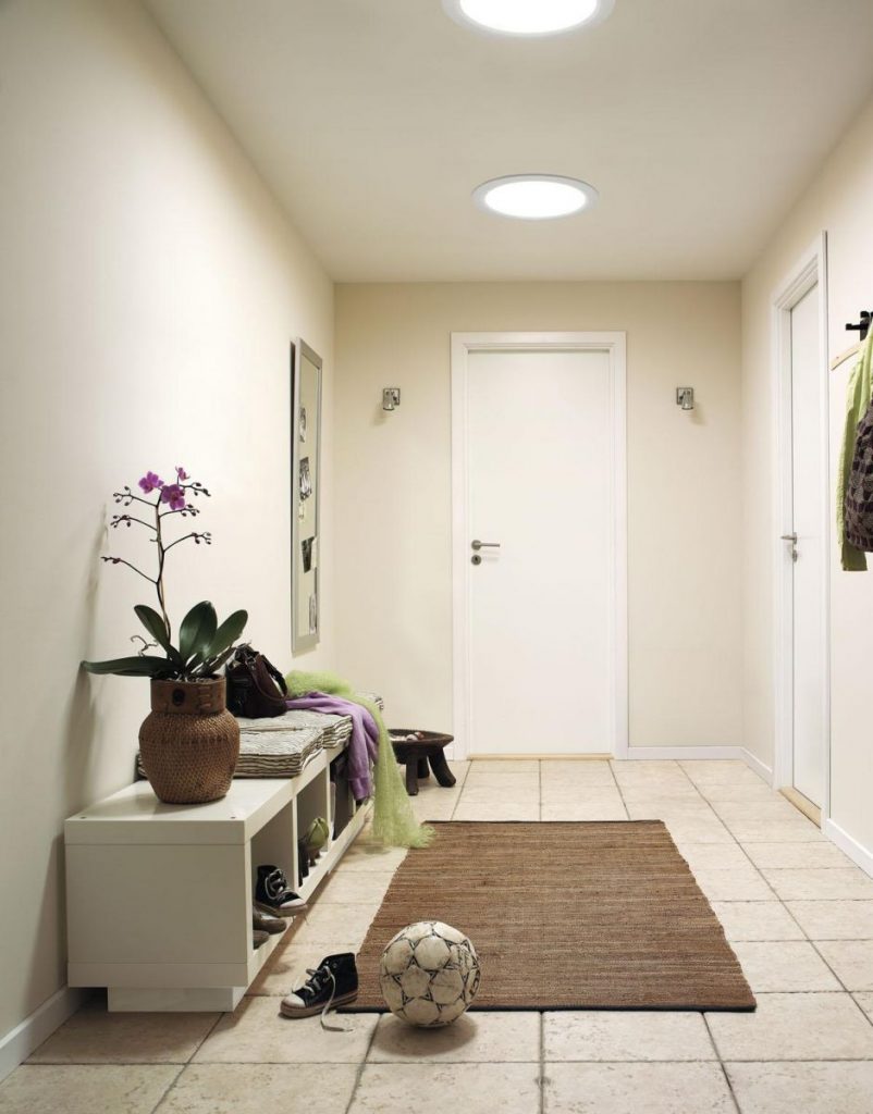 Небольшие лампы, расставленные по всему периметру коридора, подчеркнут достоинства маленького помещения. Для прихожих с низким потолком оптимальный вариант – плоские плафоны.