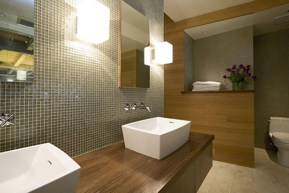 Самое главное в среднем уровне освещения – выделить важные рабочие зоны. Обычно это умывальник и зеркало. Установите с двух сторон по бокам симметрично два светильника в верхней части зеркала. Если оно небольшого размера, то и светильники выбирайте тоже поменьше.