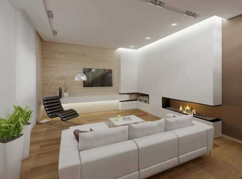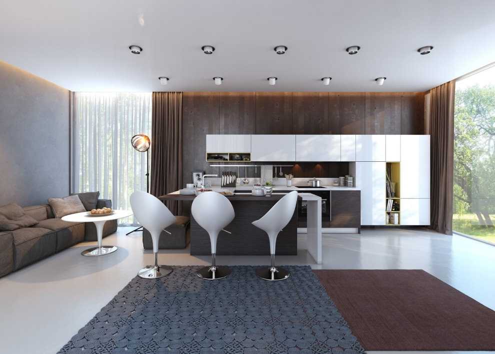 - минимализм — подойдет точечная подсветка, несколько небольших светильников с лаконичными абажурами, споты, шинные системы; стоит отказаться от массивной люстры в качестве единственного источника света;