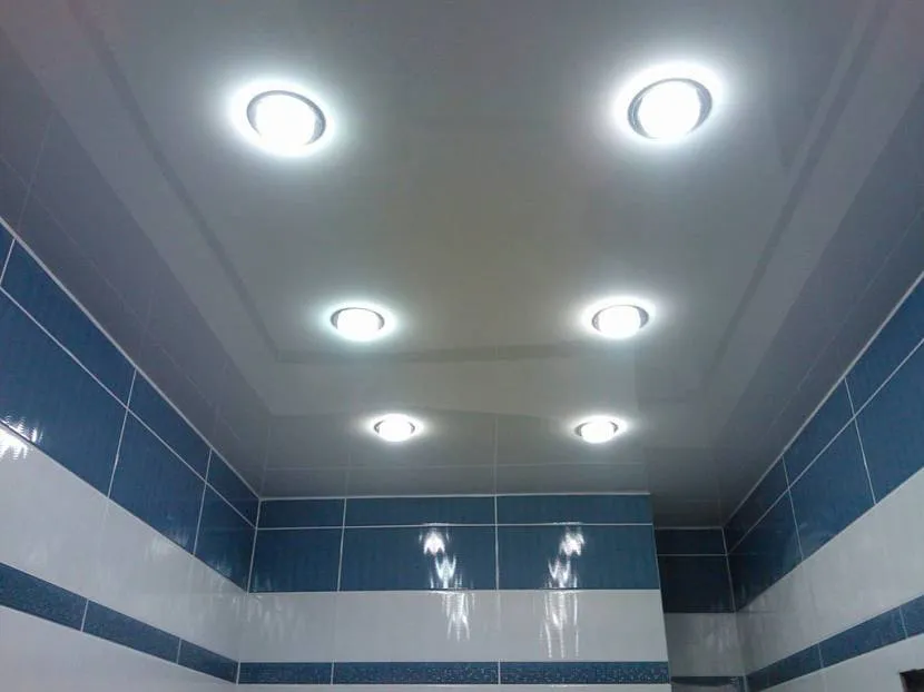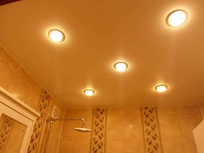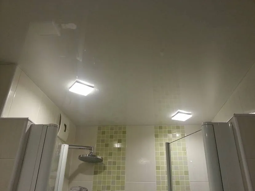Встроенный светильник. В полотнище виден только плафон или декоративное кольцо, а вся остальная часть спрятана над ним. В ванный натяжной потолок устанавливают прибор, который сделан с помощью штамповки, а не литья. Кроме этого, такой светильник имеет недостаток – лампа в нем сильнее нагревает корпус и охлаждается намного дольше. Рекомендуется использовать поворотный прибор, поскольку он имеет меньший нагрев корпуса.