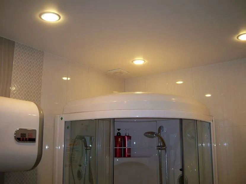 Ванный потолочный осветительный прибор предполагает, что плафон и натяжной потолок располагаются на одном уровне. На фото ниже показан потолочный прибор.