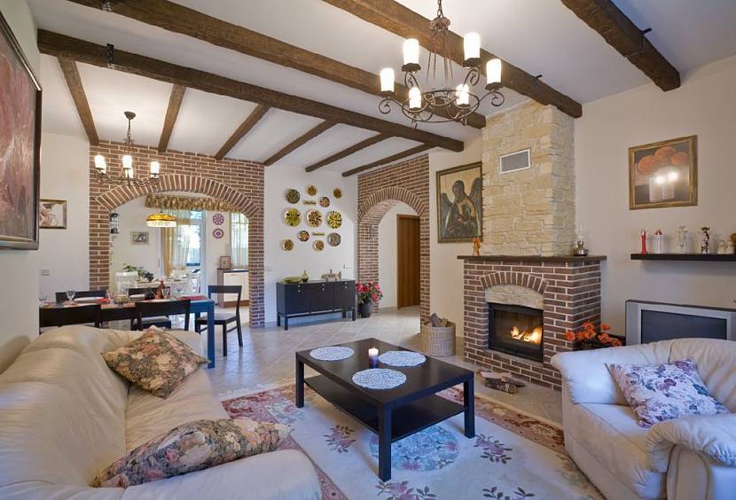 - Кирпичные стены. Преимущество стен из кирпича в том, что они дают возможность использовать любые материалы для отделки стен на даче. Эффектный и стильный вариант — мокрая штукатурка. Это, что называется, классика жанра. Если в доме не предусмотрено отопление, то необходимо учесть — на штукатурке будет образовываться конденсат. Избежать этого нельзя, но можно использовать влагостойкую штукатурку.