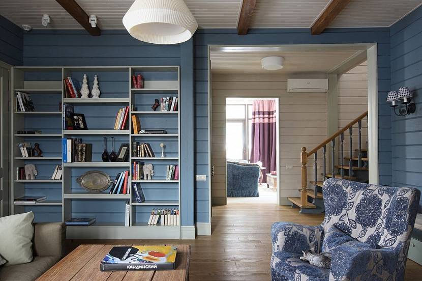 - Стены из профилированного или клееного бруса. Для обшивки таких стен используются стеновые панели, гипсокартон и реечные материалы. Это повышает звуко- и теплоизоляцию. Стены из натурального дерева обычно не закрывают обоями или краской, используют прозрачные материалы, такие как воск или лак. Впрочем, в некоторых случаях дизайнерская задумка предполагает применение финишных отделочных материалов. Но помните — деревянная конструкция дает усадку, поэтому не торопитесь покрывать стены финишной отделкой до окончания этого процесса.
