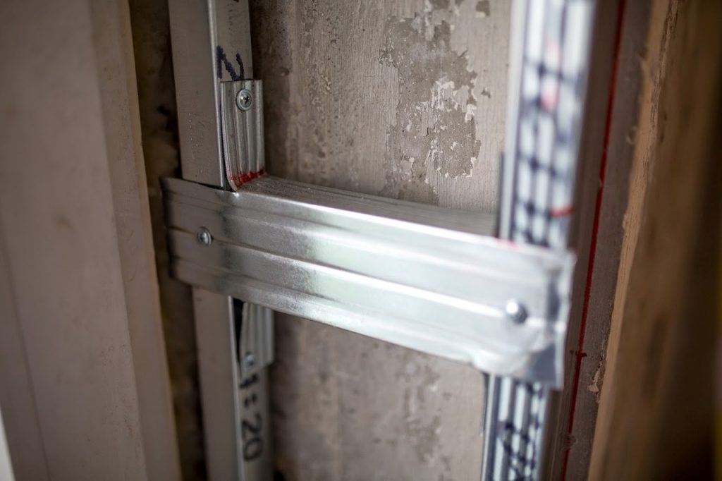 - Крепление можно также производить по оцинкованным направляющим, но для этого потребуется устройство не менее 2 слоёв ГКЛ и наличие свободного места, так как конструкция «съедает» не менее 50 мм с каждой стороны проёма.