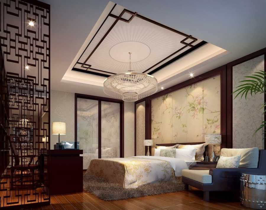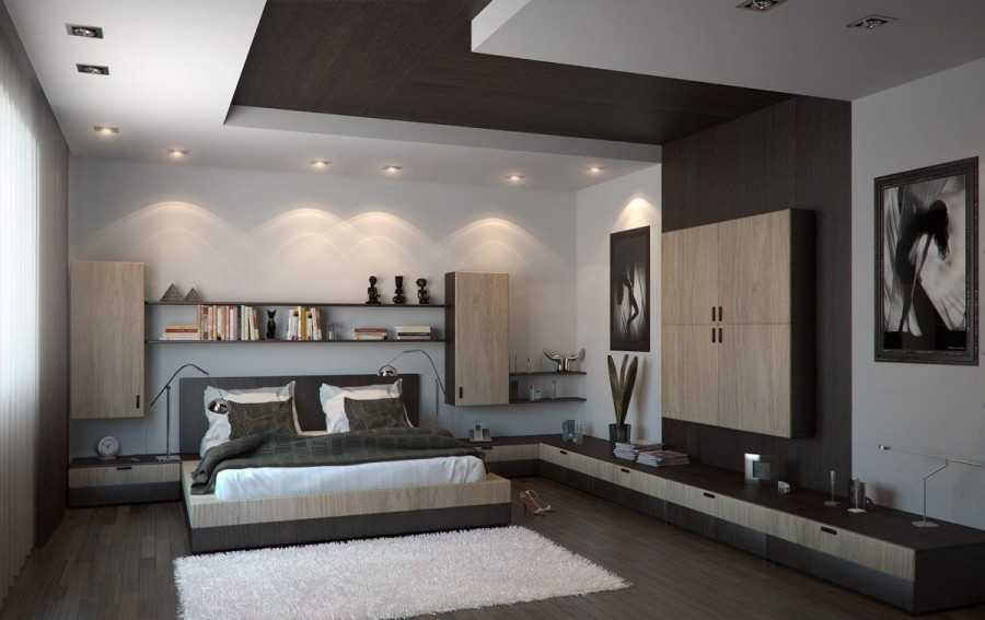 - Чтобы «приподнять» потолок в спальне, использовать прием зонирования плоскости. Например, над кроватью сделать зеркальный потолок или покрытие более светлого тона, чем на остальной плоскости.