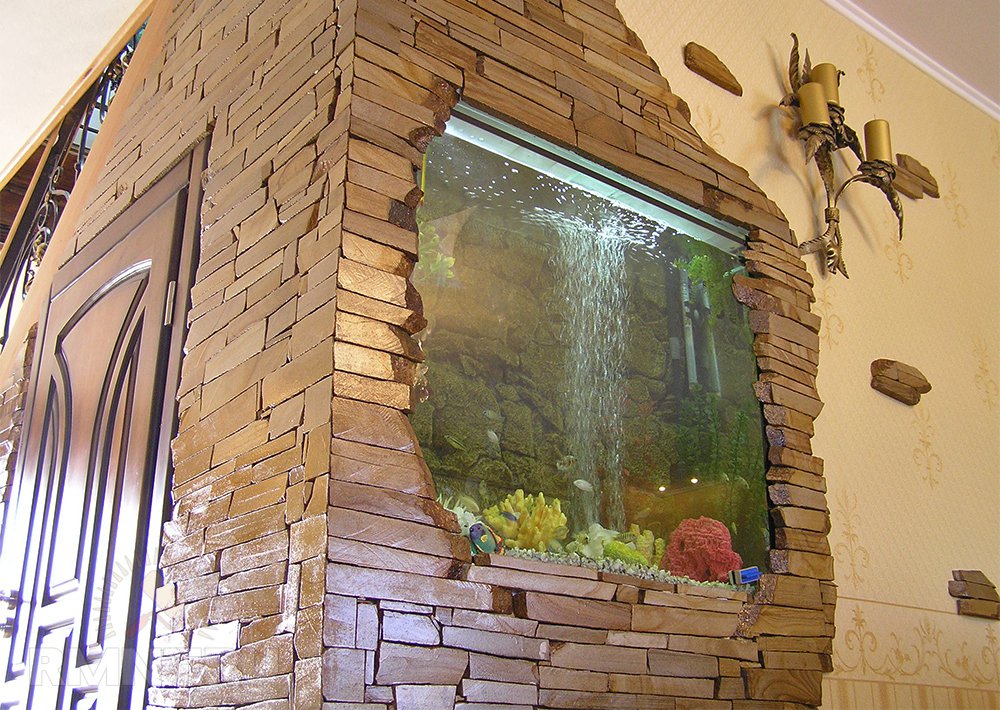 Плитка изготавливается из разных материалов и монтируется на стену поштучно при помощи клеевого состава. Использовать плитку можно для декорирования сложных форм — арочных проемов, ниш, колонн.