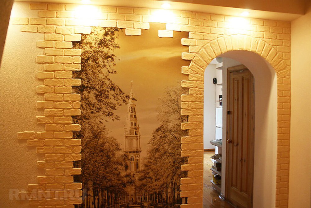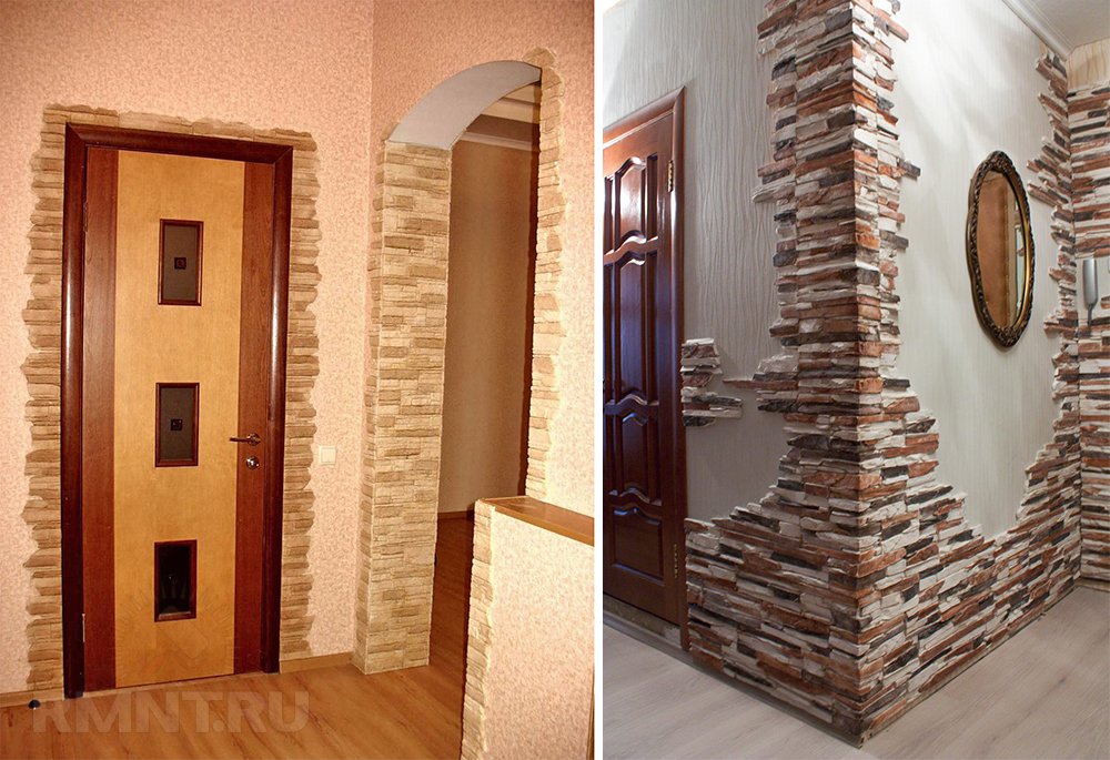 Особенно эффективным приёмом считается обрамление каменным декором панно, зеркал и участков, покрытых фотообоями. В прихожей традиционно обрамляют камнем проём входной двери: при светлом тоне основной отделки будет уместной скромная однорядная каменная облицовка по внутренней части откоса, для более просторных помещений с насыщенным цветом обоев хорошо подойдёт полное обрамление с каменным наличником.