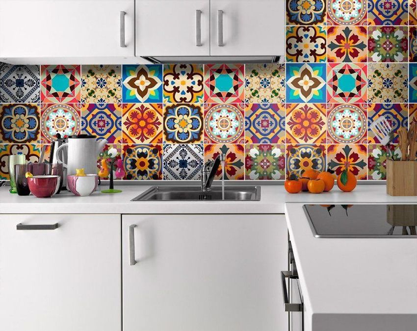 - Калейдоскоп. В данном случае все соты и квадратная плитка в нескольких оттенках наклеивается хаотично. Решение в виде калейдоскопа прекрасно смотрится в современных кухнях.