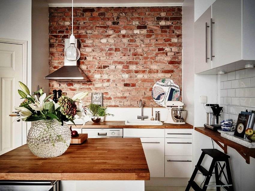 Отличный пример отделки обеденной зоны декоративным кирпичом. Фотообои привнесут в кухню загородный элемент. Четкие линии рабочей зоны, белый цвет, подсветка прекрасно гармонируют с фактурной стеной напротив. Зеленые растения добавят естественности помещению.