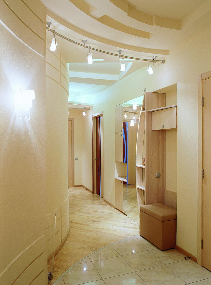 Свет – ключевой вопрос организации пространства. Довольно часто коридор и прихожая служат комнатой для шкафов, хранения вещей. Обычно это закрытая от естественного света комната, в типовой квартире редко встречаются окна. По этой причине желательно использовать светлые цвета. Темные, тесные, узкие коридоры – довольно рискованное решение.