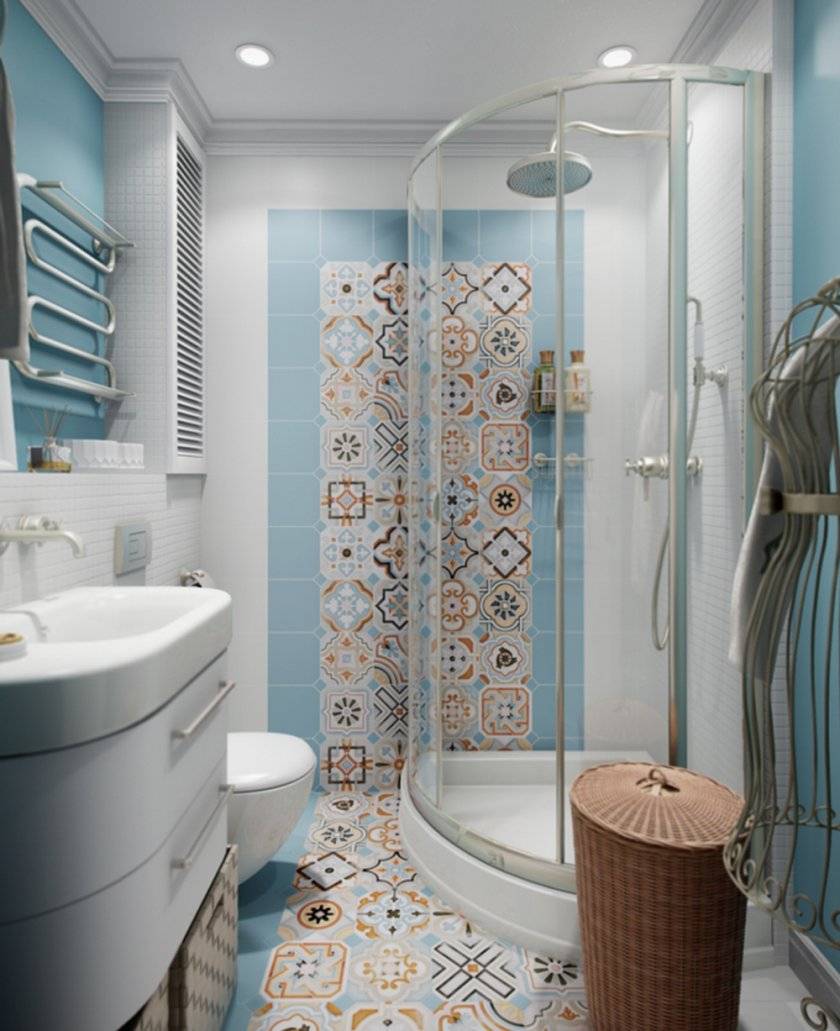На фото справа интерьер синего санузла с шахматным полом диагональной укладки, такой прием визуально раздвигает стены.