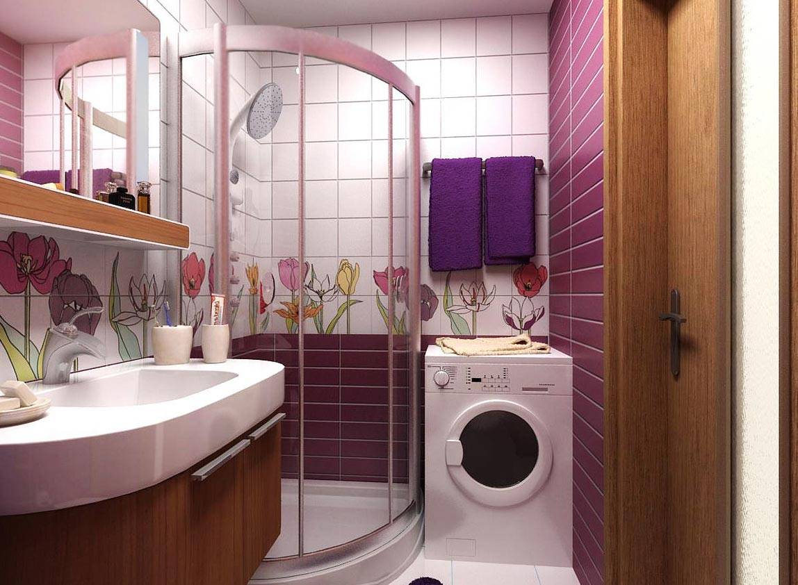 Гоните от себя любые мысли о пано и цветочках, об улучшении или исправлении «слишком простого» интерьера ванной комнаты дополнительной отделкой. Хорошие примеры можно посмотреть в материале про совмещенный санузел 4 кв.м со стиральной машиной, т.к. там загрузка предметами максимальная и любая сложная отделка сделает только хуже.