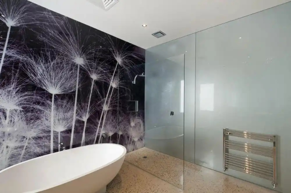 Стеклянная плитка смотрится привлекательно и добавляет шика ванной комнате. С ее помощью разделяют зоны, создают фартуки. На стекле можно напечатать фотографии любой сложности, поэтому ваш дизайн обязательно удивит друзей, а ванная будет выглядеть оригинально.