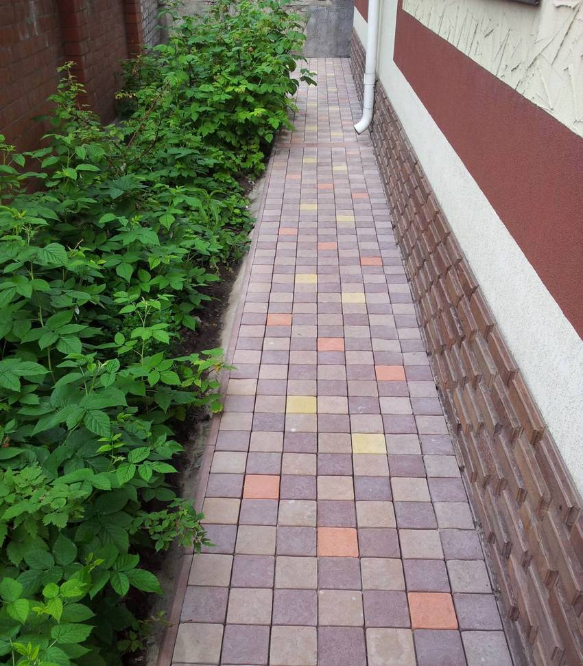 Разновидность жесткой отмостки. Плитку укладывают поверх бетонного раствора. Самой износостойкой считается клинкерная. Выглядеть покрытие будет красиво. Но цены, указанные на нее в прайсах компаний, довольно высоки. Бюджетная альтернатива — тротуарная цветная плитка из бетона.