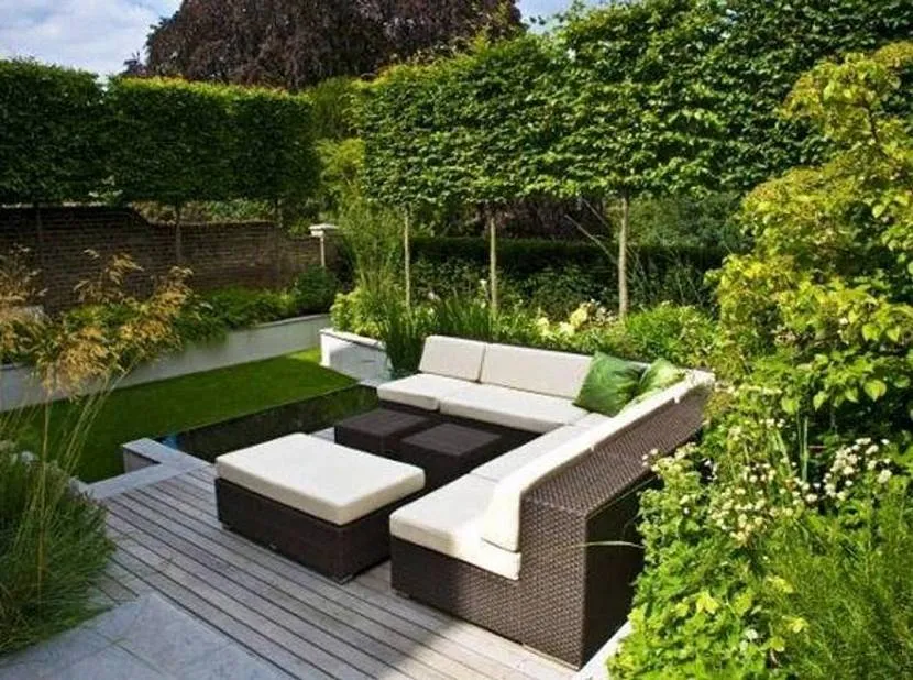 Зарытый или полузакрытый палисадник. Его можно отгородить по периметру или со стороны улицы с помощью живой изгороди или ограды из металла, кирпича, камня, дерева, металлической сетки. Ограждение часто препятствует проникновению излишнего шума или пыли с улицы.