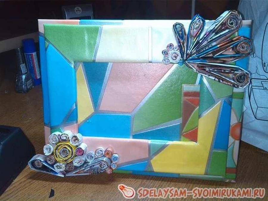 Самый очевидный способ украсить изделие – использовать разноцветную бумагу. Но и этот вариант можно сделать очень интересным. Достаточно скрутить материал в трубочку и в таком виде поместить на основу. Рамка, исполненная в этой технике, подойдет в качестве детской поделки или стильного украшения для комнаты подростка. Кроме того, это отличный способ утилизировать старые.