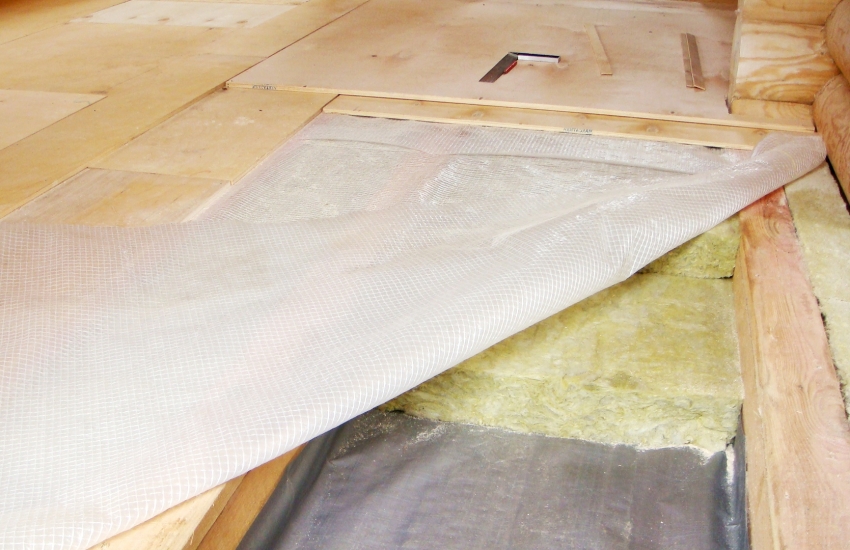 - утеплитель накрывают слоем пароизоляции, которую надежно прикрепляют к балкам перекрытия;