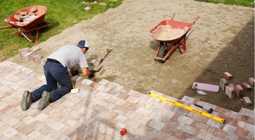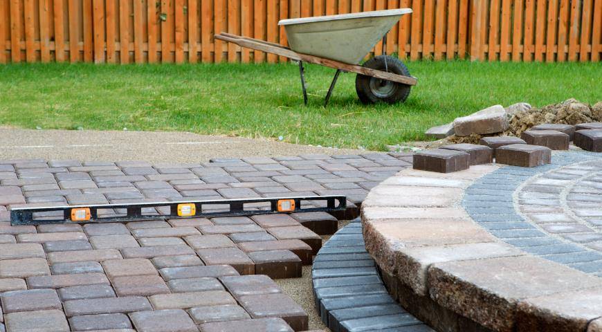 Выравнивание с помощью уровня и резинового молотка тротуарной плитки