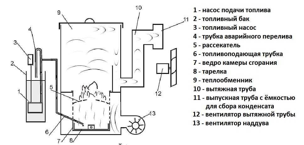 Этот раздел предназначен для новичков, кому раньше не приходилось заниматься отопительным оборудованием на жидком топливе – отработке либо солярке. Представленный на чертеже котел работает по следующей схеме: