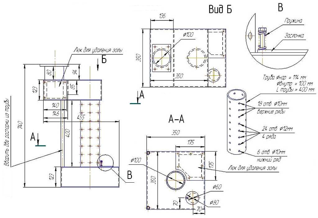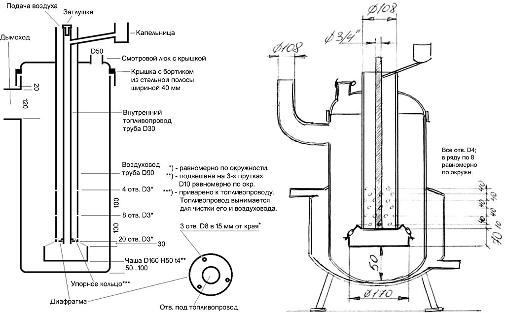 дожигатель смастерить из трубы DN40, изменив количество и диаметр отверстий (точнее указано на чертеже);