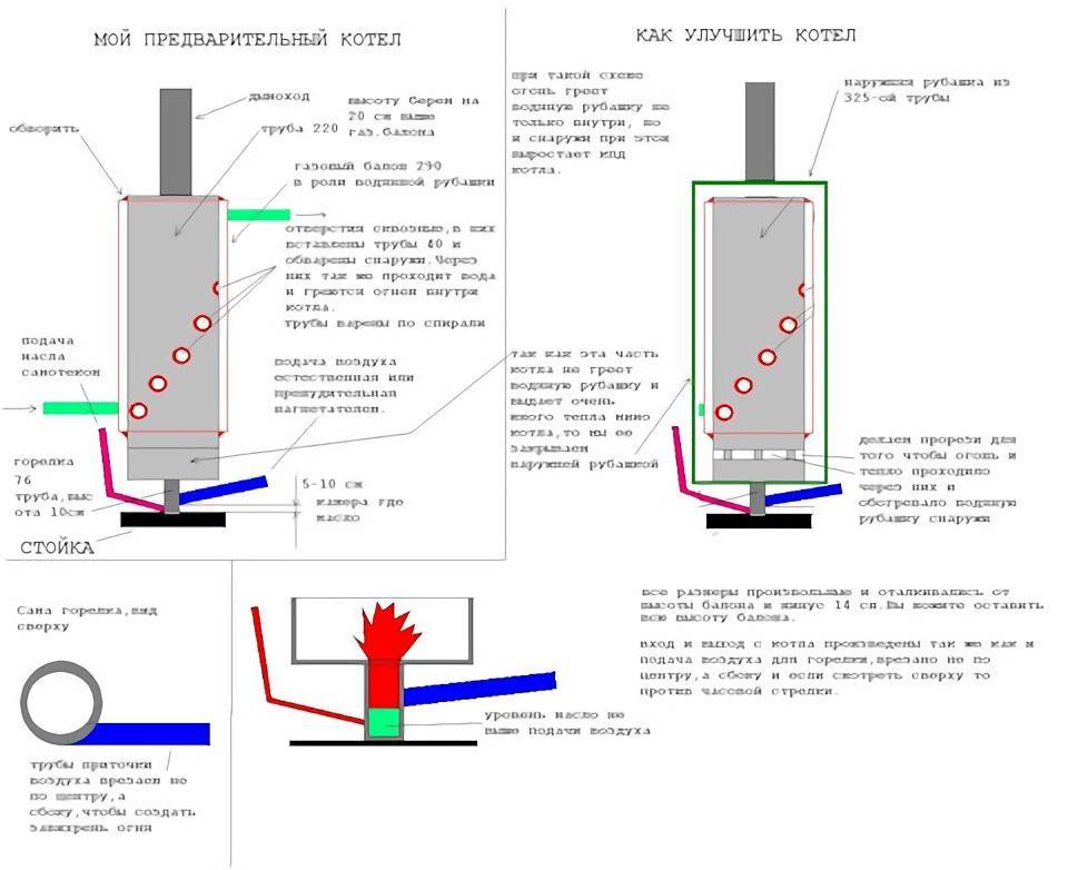 Если нужно сделать водяное отопление на печи с отработкой, нужно пропустить через верхнюю камеру 4-5 змеевиков, подключенных параллельно. Систему нужно будет дополнить циркуляционным насосом и вентилятором. Печь на отработке из газового баллона — чертеж