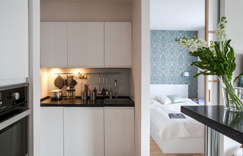 Для оформления стен в однокомнатной квартире лучше выбирать светлые тона, которые зрительно увеличат пространство