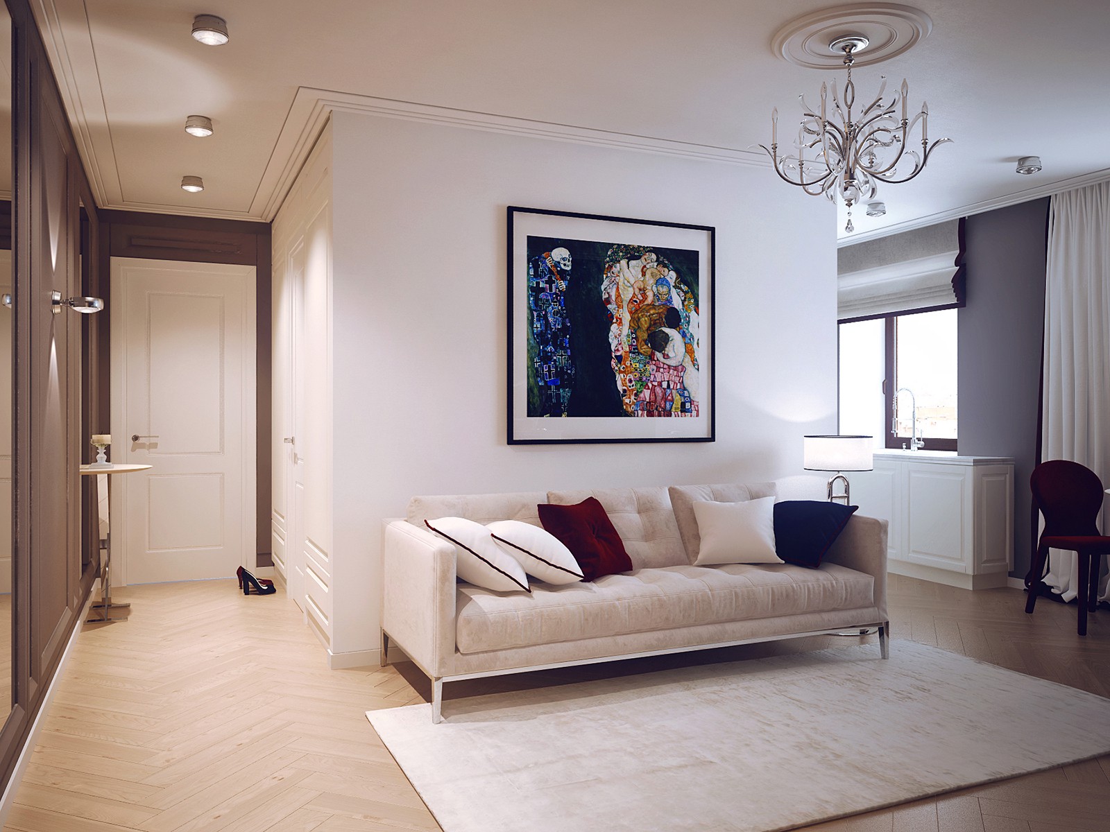Зонирование цветом. В дизайне интерьера сохраняется общий стиль и концепция, но используются разные цветовые решения. Такой прием наиболее легко воспринимается, не дает слишком резкого разграничения и сохраняет простор, полученный за счет объединения прихожей и гостиной.