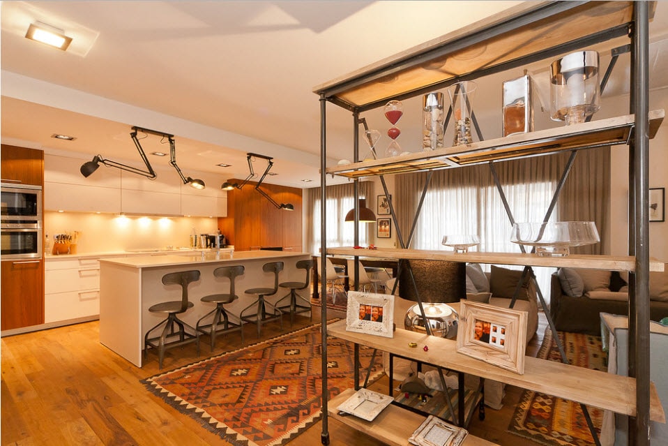 Ощущение легкости и простора возникает в комнатах, в которых перегородка не достигает потолка, примыкает к стене. Она может заменять обычный стол, низкий стеллаж, барную стойку.