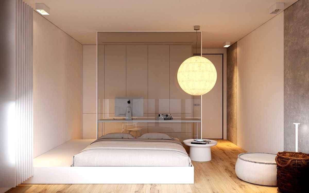 В спальне, выполненной в стиле минимализм, стеклянная перегородка за изголовьем кровати отделяет рабочую зону. Стиль требует использование минимального количество деталей, поэтому дизайнер решил использовать стекло, чтобы не нарушать целостность комнаты и не «разрывать» её дополнительными стенами.