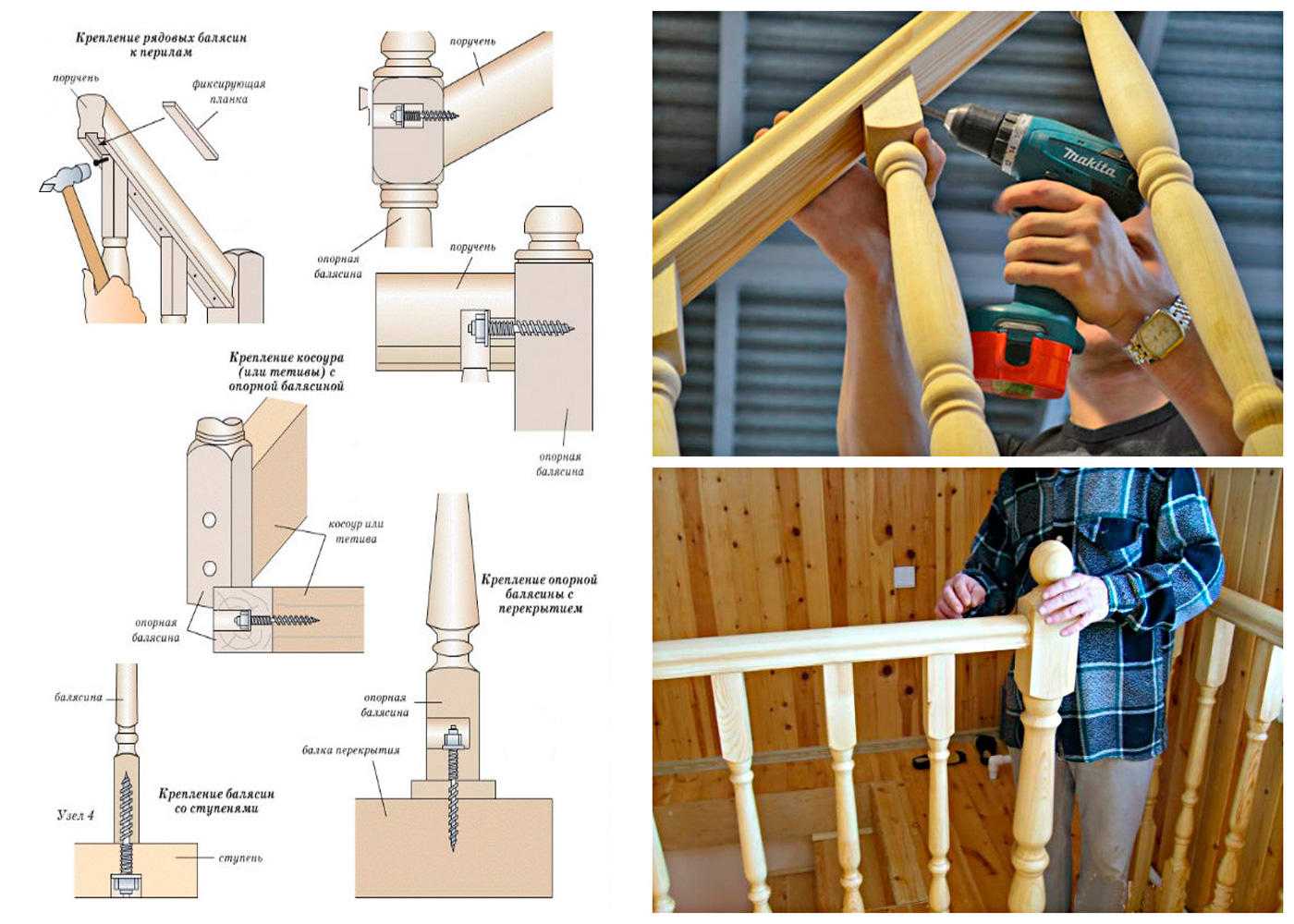 Если говорить конкретно об узлах соединения балясин, то здесь может использоваться три способа крепления: