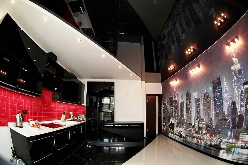 Фото 2 – Чёрный глянцевый натяжной потолок. Редкий случай, когда потолок черного цвета гармонично смотрится в интерьере жилой квартиры