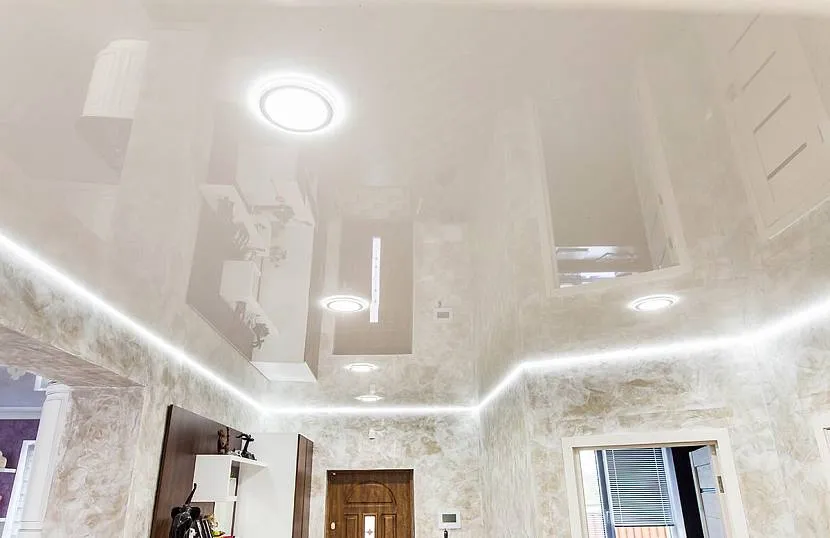 Поверхность глянцевых потолков гладкая, блестящая, с зеркальными бликами, благодаря чему поверхность такого потолка отражает свет и предметы интерьера.