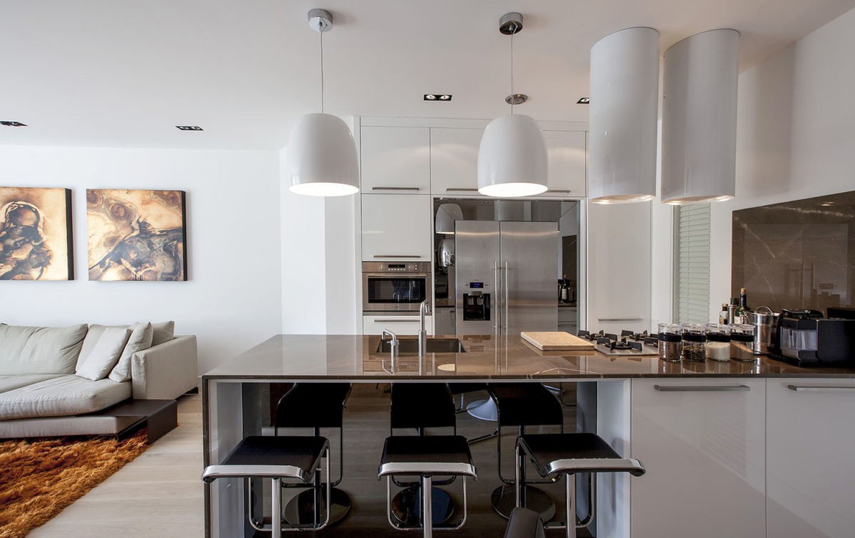 Между кухонной и гостиной зонами располагается барная стойка. Она может использоваться и как рабочая поверхность, и как стол для перекусов или обедов. Стеклянные светильники-подвесы над ней обеспечивают дополнительное освещение и зрительно отделяют кухню от гостиной. Кроме того, обеденная зоны дополнительно выделяется напольным покрытием – ламинатом светлого тона.
