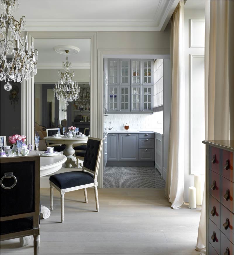 Чтобы накрывать стол в гостиной было удобно, нужно предусмотреть широкий дверной проем и разместить стол так, чтобы к нему можно было беспрепятственно подойти с подносом на руках или сервировочной тележкой.
