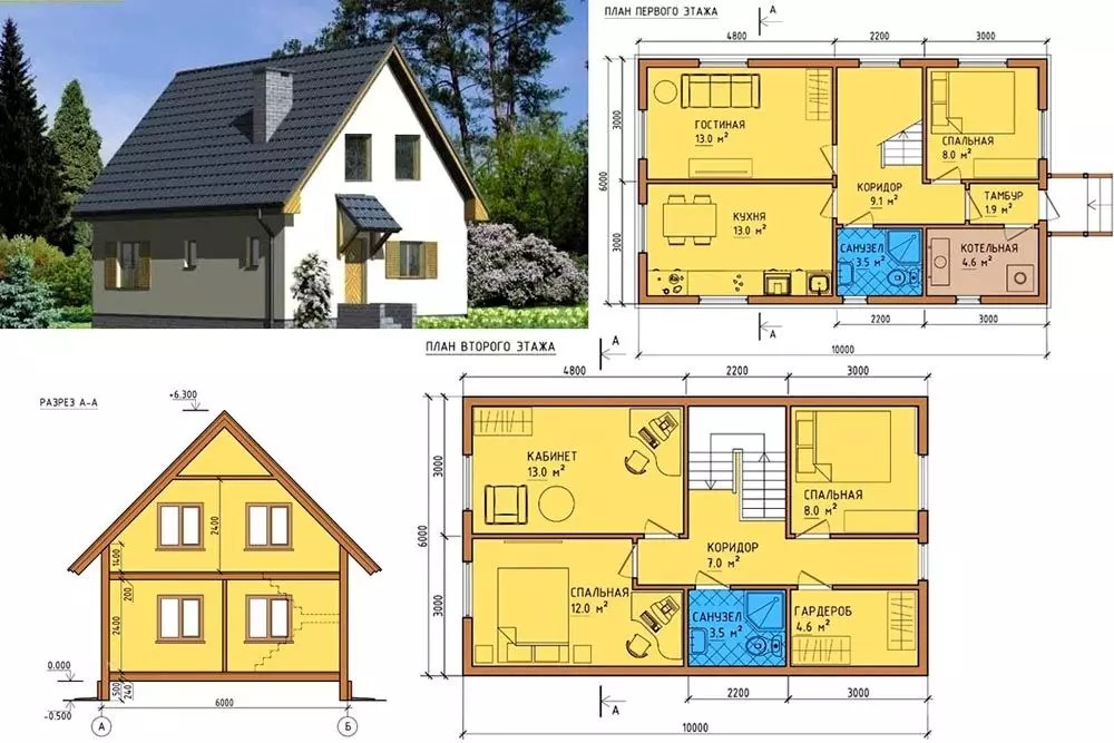Компактный проект дома 6 на 10 м без гаража с котельной на первом этаже. Кухня достаточно просторная 13,0 кв.м. При таком планировании наглядно можно увидеть как коридор 9,0 кв.м занял основное место на первом этаже. Тем не менее, осталось место для общей гостиной и гостевой спальни. На обоих этажах находятся просторные ванные комнаты.