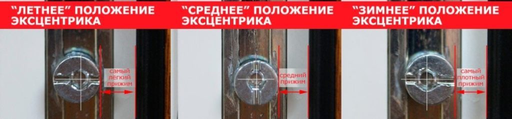 - для регулировки эксцентриков предусмотрено два положения: зимнее и летнее. Летнее положение обеспечивает неплотное прилегание оконных створок к раме для микропроветривания. Для выставления зимнего режима эксцентрики поворачиваются на 90 градусов. Подобные элементы находятся на торцевой стороне створок.