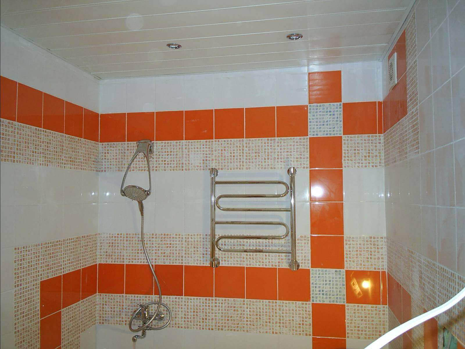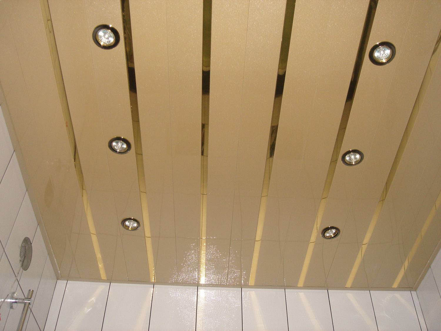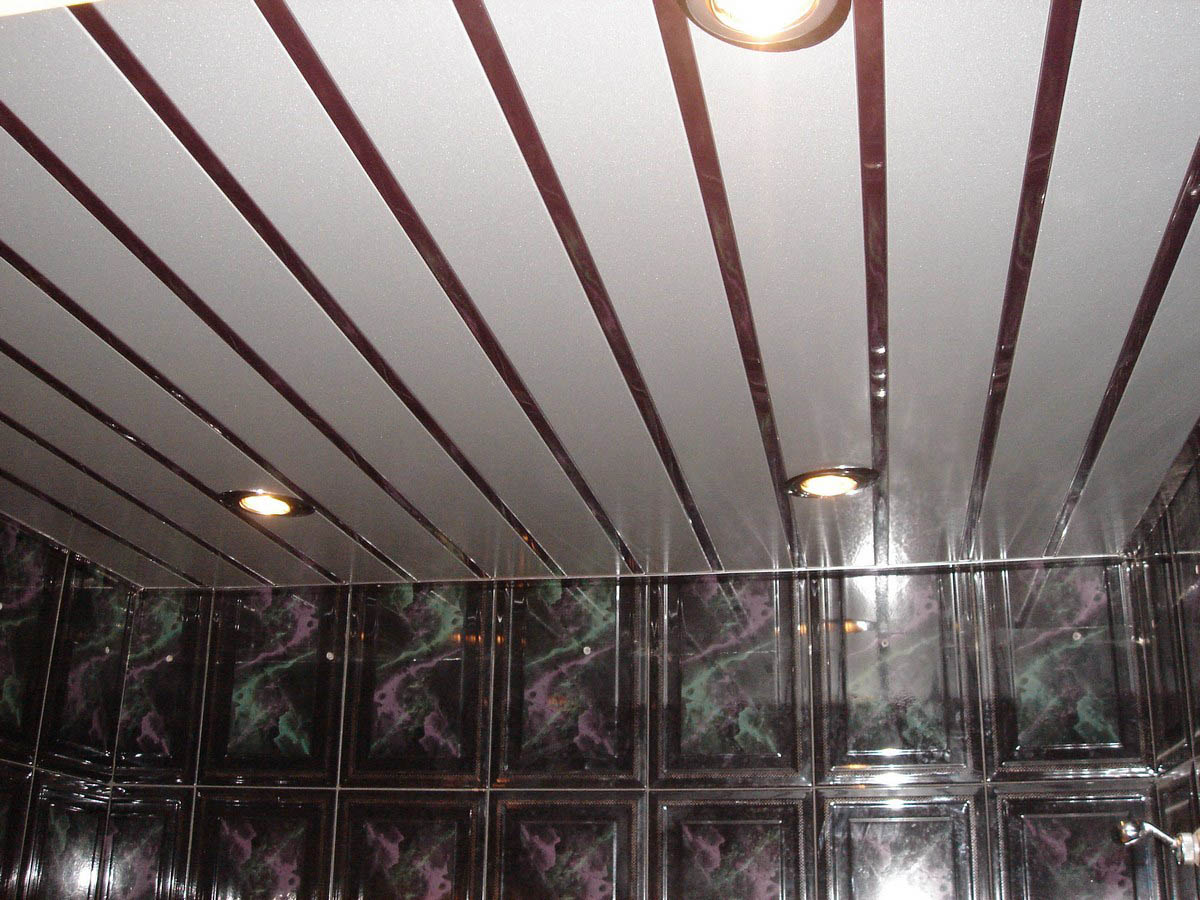 Отделка потолка в ванной комнате производится с помощью целостной панели, которая монтируется с помощью полос длинной 2.6 — 3.0 метра.