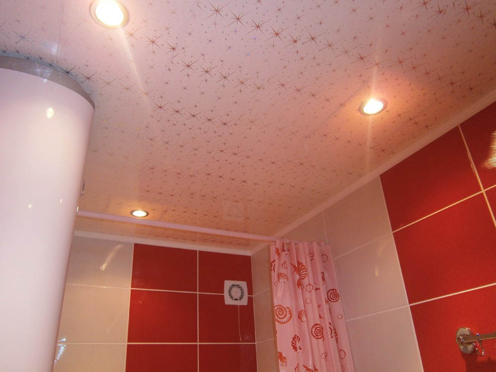 Для формирования пространства в ванной, не маловажную роль играет освещение. Потолок в ванной комнате, сделанный из пластиковых панелей, дает возможность устанавливать любое освещение, все зависит от вашей фантазии. А также потолочные панели, можно сделать не только поперек, но вдоль длины ванной, еще и по диагонали. Они дают возможность создавать всевозможные рисунки (см. Потолочные светильники для ванной: виды и установка).