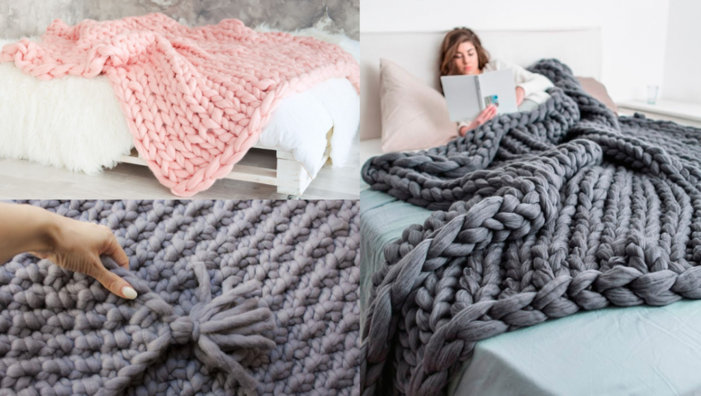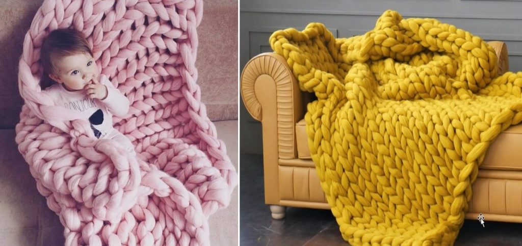 - Вязаный плед крупной вязки довольно тяжелый, поэтому его используют как декоративный элемент.