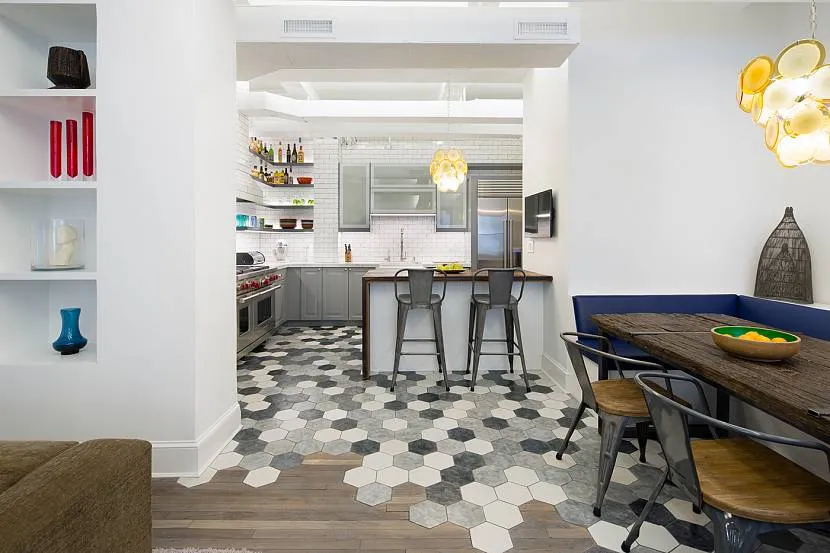 На фото интерьер кухни с разноцветной керамической плиткой в форме шестигранника на полу.