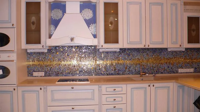 Этот вариант мозаики изготавливается из резины или керамики, покрывается сверху тонким слоем нержавеющей стали, бронзы или латуни. Недостатком такого способа выполнить фартук является быстрое истирание. Но внешне он будет весьма привлекательным, так как имеет красивые оттенки стального и золотого. Отлично подойдет для современного стиля техно.