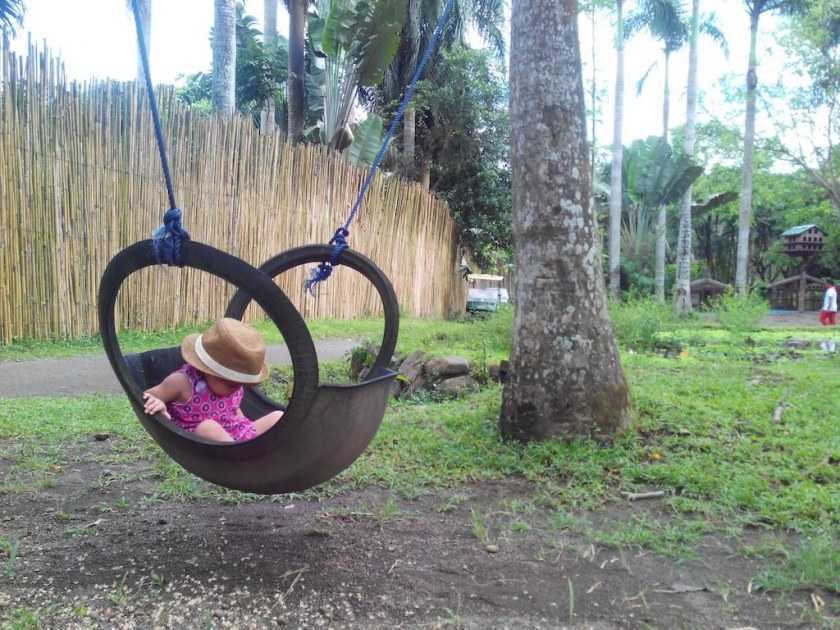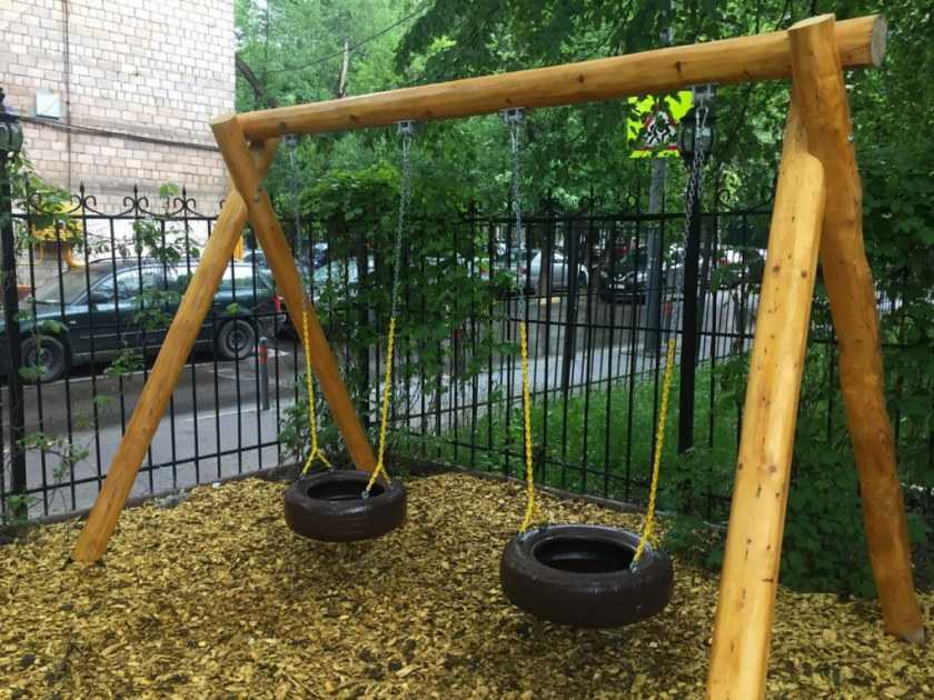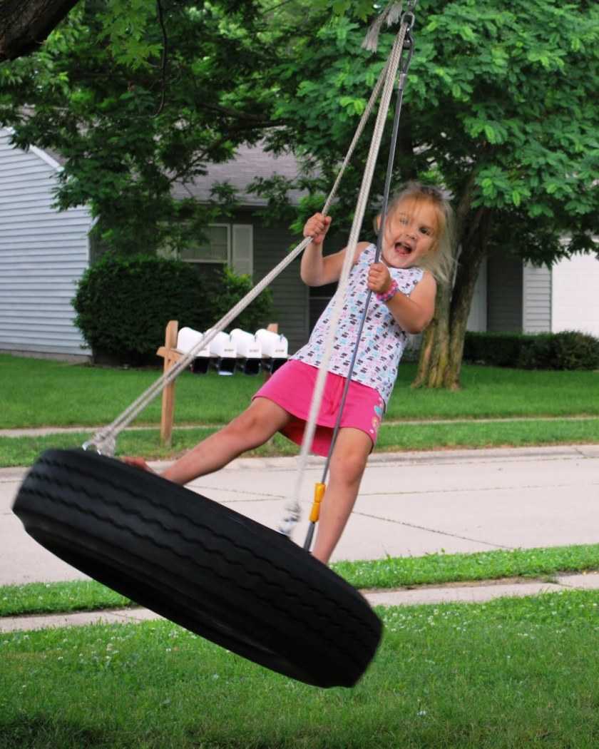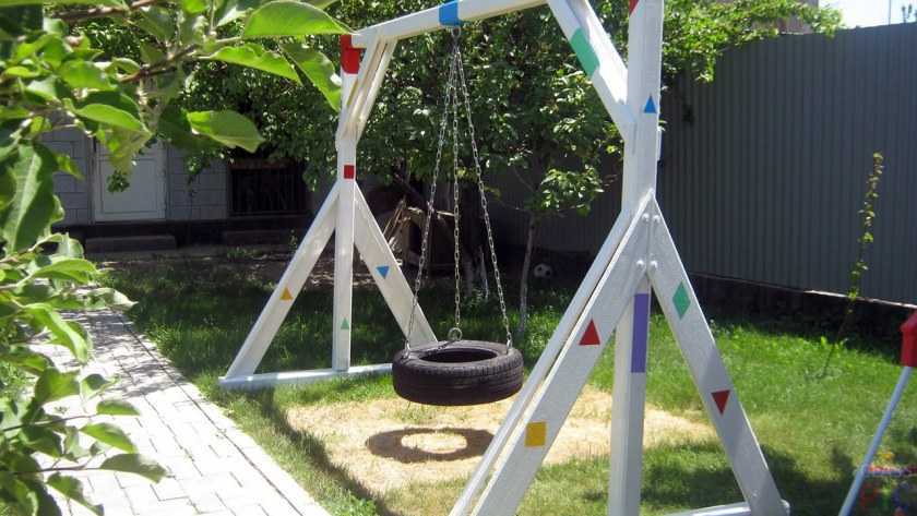 Если количество автомобильных шин ограничено, то в качестве поделки из автомобильных покрышек могут предстать качели. Причем распиливать покрышку не придется: