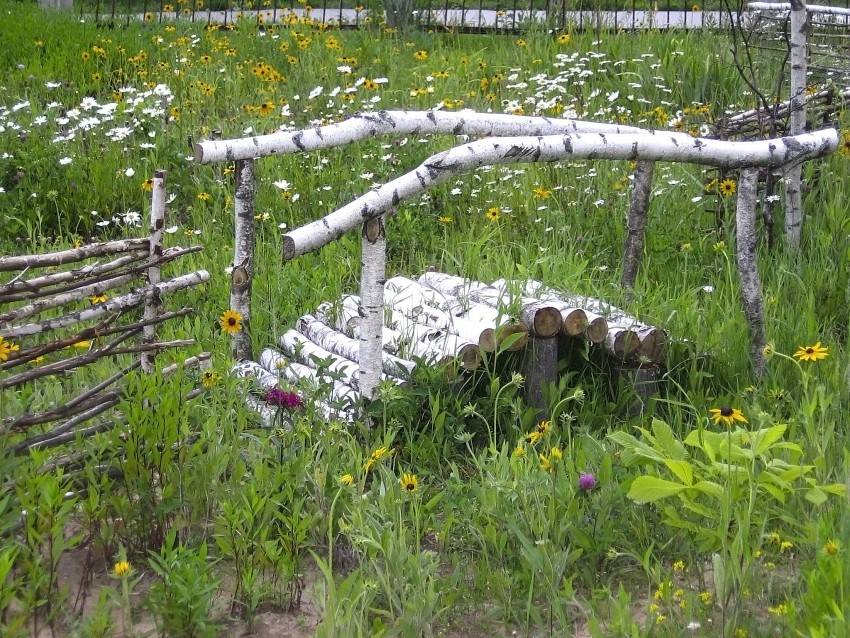 Чудесно смотрится плетёное ограждение из хвороста, выполненное в стилистике кантри. Приковывают к себе взгляды цветник, разбитый в старом пне, причудливая фигура, вырезанная из ствола засохшего дерева, колодец, сложенный из брёвен.