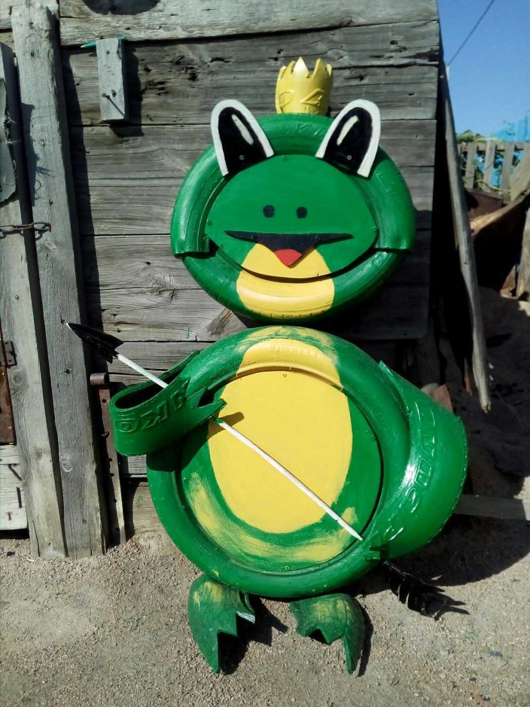 Для поделки надо подготовить три большие шины и две, например, — от детского велосипеда. Всю отобранную резину покрасьте в приятный зеленый цвет. Из двух больших создайте тело лягушонка – просто установите их на одной линии, закрепите. Вертикально на такую конструкцию устанавливается третья шина. Это – голова. Данная деталь не будет функционировать как клумбы, а только применяться как элемент декора. Начинается сложный этап – на третью шину монтируйте два маленьких колеса – это будут глаза. Аккуратно нарисуйте игривые зрачки лягушонка на двух маленьких колесах. Для крепления всех деталей изделия можно использовать шуруповерт и соответствующие крепежи. Из тонких садовых шлангов вполне реально сделать лапки.